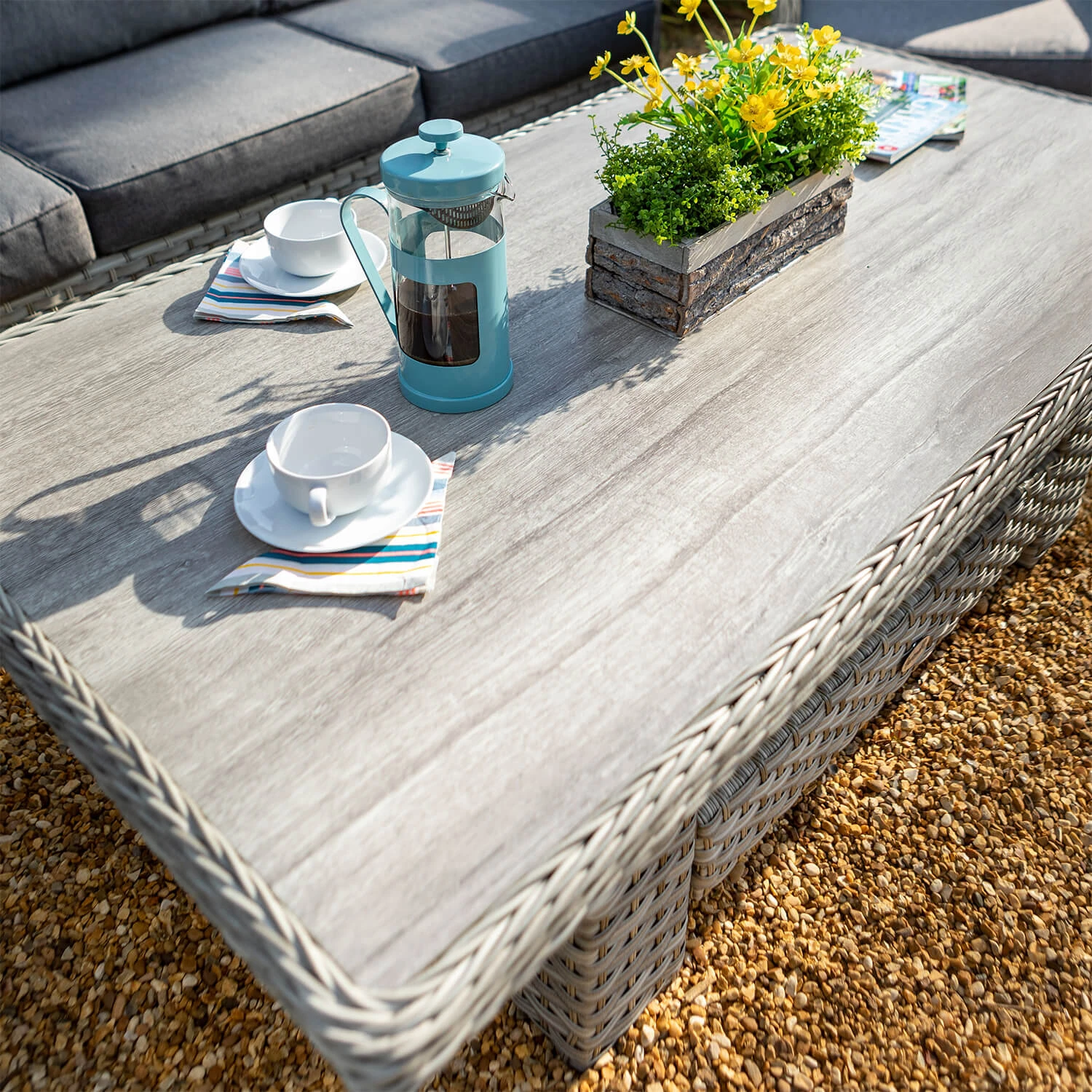Complimenting the seating is an adjustable table, which can be lowered or heightened depending on your preference. Rectangular in shape, it has a matching weave frame, and mock wooden top in an ash grey colour.