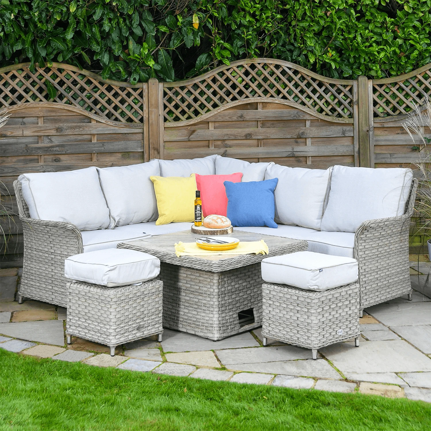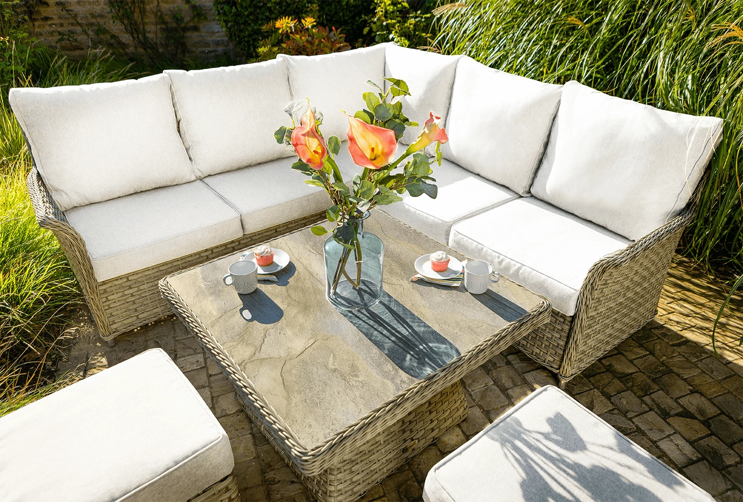 The set is made from robust materials making it practically maintenance free and able to be left outside in all weather conditions. Its synthetic resin weave is weather resistant and the aluminium framework is rustproof as well as sturdy. The set has been topped with Hartman’s Weatherrready cushions which make use of a clever design that allows them to be left outside all summer season (bring them in over winter).