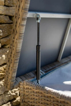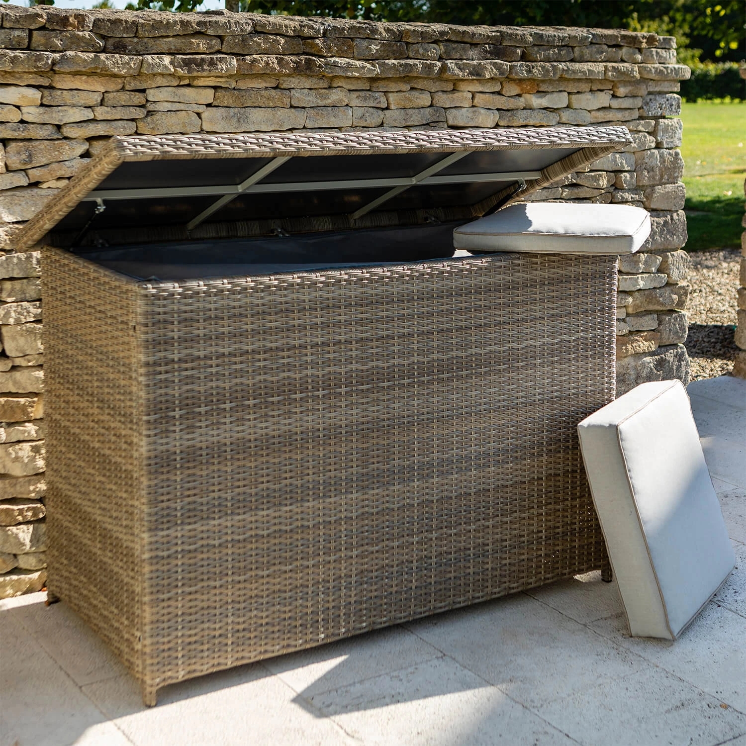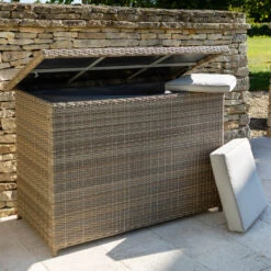 The storage box is made of a strong synthetic resin weave in an attractive double curve, beech finish, and is sturdy enough to be left out all year long, without worry of weather damage. The box has a removeable, waterproof lining, to keep the cushions dry over the summer months. While cushions will need to be stored inside over winter, the box itself can be left out and used to store other items over the winter period, such as tools and pots.