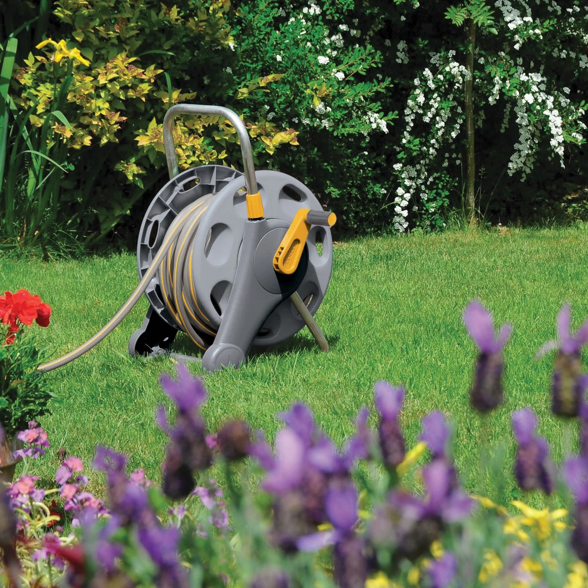 45m 2in1 Reel with 25m hose (assembled). Can be used freestanding or wall mounted. With handle for easy and tangle free winding.