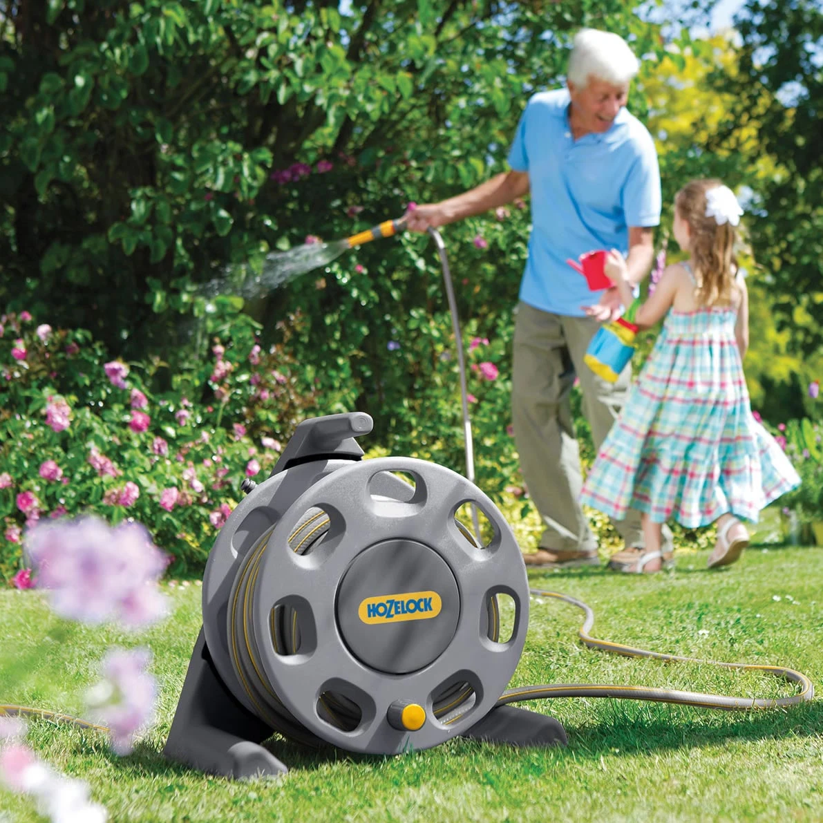This free standing hose reel is the ideal complete portable system. It comes with hose, tap connector, nozzle and all necessary fittings.