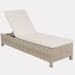 The lounger features a full length comfy cushion, on top of hardy synthetic, rattan weave, which is handwoven onto a robust aluminium frame. The lounger frame is weatherproof and can be left outside all year, while the cushions should be brought in in bad weather.