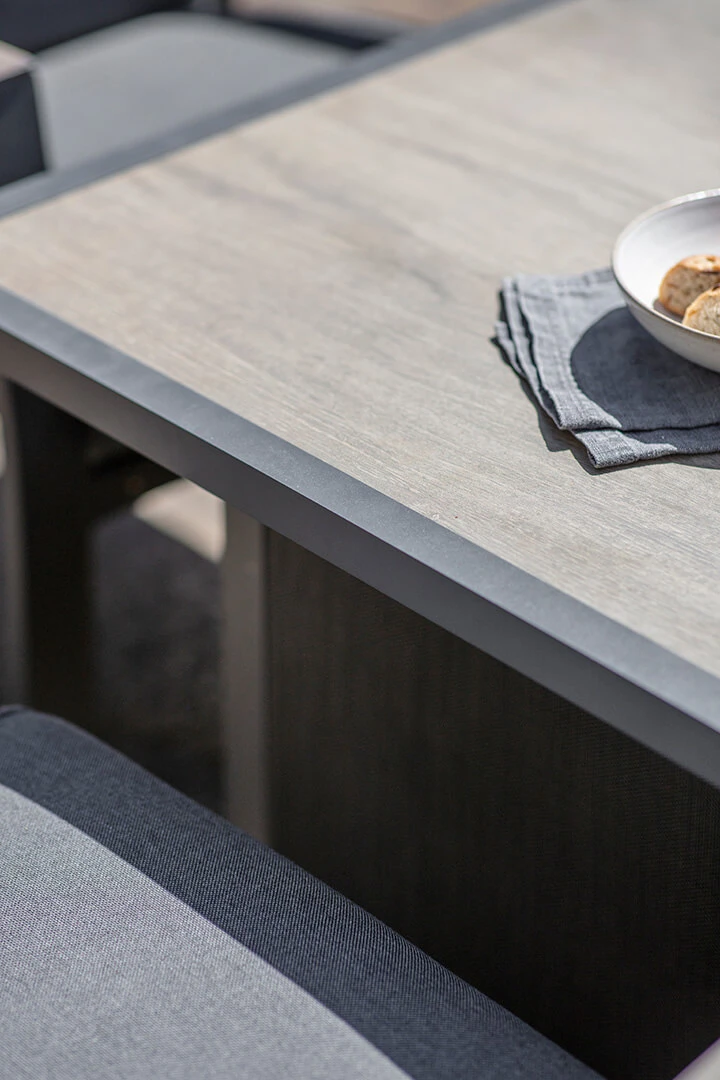 The set is made from durable aluminium in a contemporary grey tone, while the table top has a wood effect ceramic glass top to perfectly match the set.